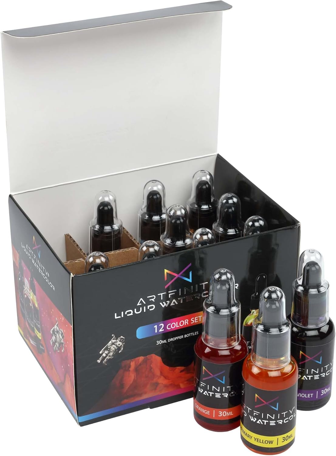 Introducing the Artfinity Liquid Watercolor 30 ml Bottle, an essential addition to any artist’s toolkit. This vibrant, dye-based watercolor bottle paint is designed to unleash your creativity, offering an array of possibilities for both traditional and contemporary art forms. The highly concentrated watercolor liquid delivers intense colors that can be easily diluted with water, allowing for a broad spectrum of shades and tones. Each 30 ml glass bottle is equipped with a convenient glass pipette, ensuring precise application every time. This feature is particularly beneficial for techniques requiring detailed work, such as calligraphy hand lettering and airbrushing. The liquid water colors are versatile and can be applied to wet or dry paper, making it suitable for various techniques and effects. From creating stunning gradations to transparent effects, this watercolor ink offers endless possibilities. One of the distinct advantages of the Artfinity Liquid Watercolor is its short drying time, enabling artists to work efficiently without long wait periods. Moreover, any dried areas of color can be effortlessly reactivated and reworked with a wet brush. This unique characteristic allows you to refine your art pieces, making this liquid water color paint ideal for those who value flexibility and precision. Artfinity’s liquid watercolors are perfect for use on paper or illustration board. They can be applied with a brush or a dip pen, offering adaptability for various artistic styles. Whether you’re looking to experiment with watercolor dye, water color dye, or explore the depth of colorations liquid watercolor paint, this set provides you with the necessary tools to achieve your desired effects. Set includes Primary Yellow, Orange, Primary Red, Alizarin Crimson, Royal Violet, Primary Blue, Indigo, Phthalo Viridian, Green Gold, Burnt Umber, Burnt Sienna, and Black