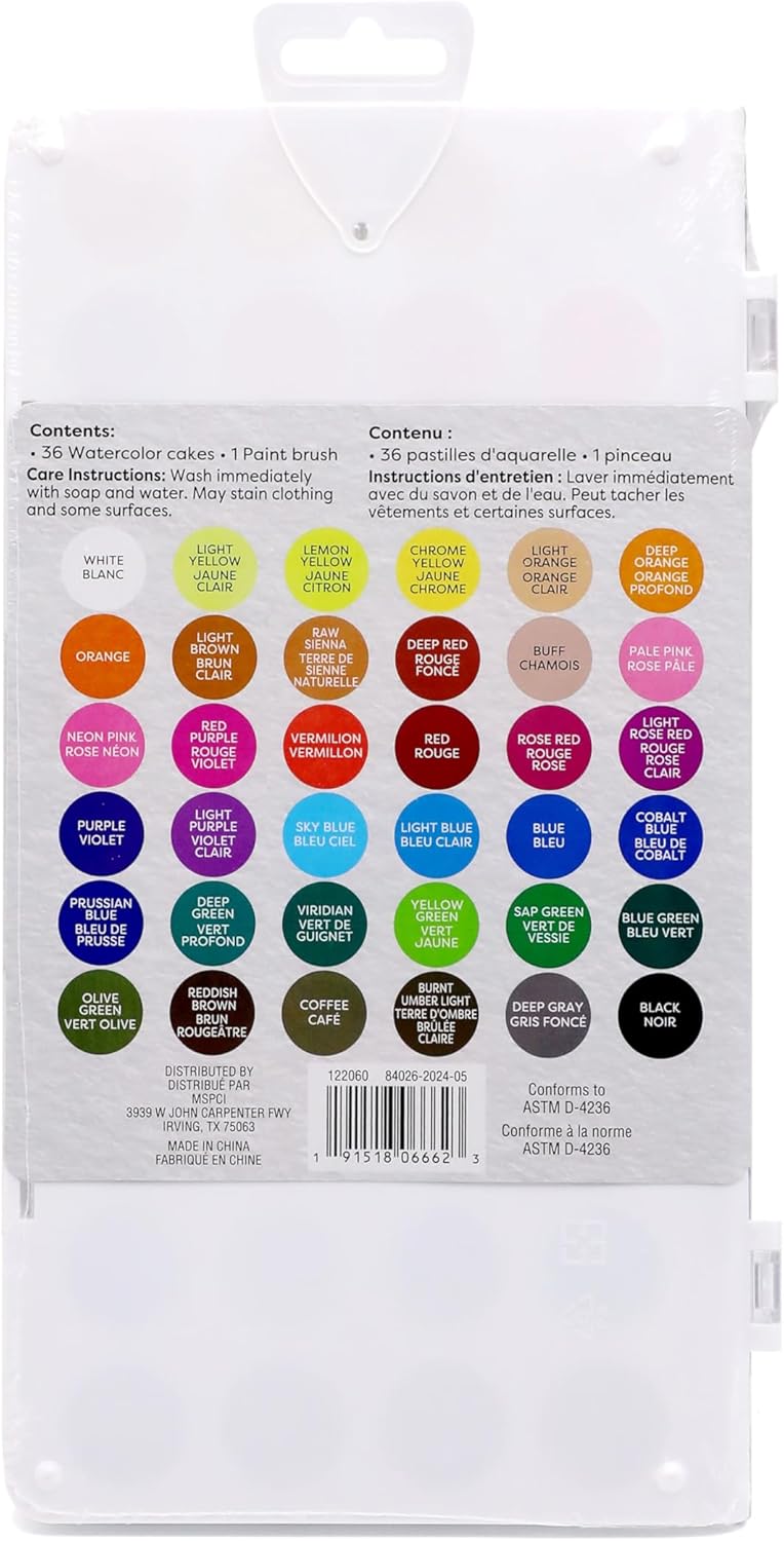 This package of brilliant watercolor paints helps you create beautiful works of art. This pigment paint collection is comprised of a wide spectrum of vivid colors which are all water soluble. The set is for any student, teacher or adult who wants to experiment with different watercolors and is looking for a great value. Details: Water soluble Excellent beginner set Contents: 36 watercolor cake colors Natural hair brush