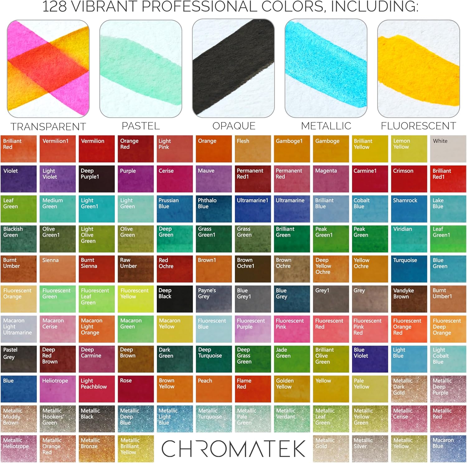 Ultimate portability! The Chromatek Watercolor kit comes with everything you need to paint on the go, including a velvet travel bag to put it all in.