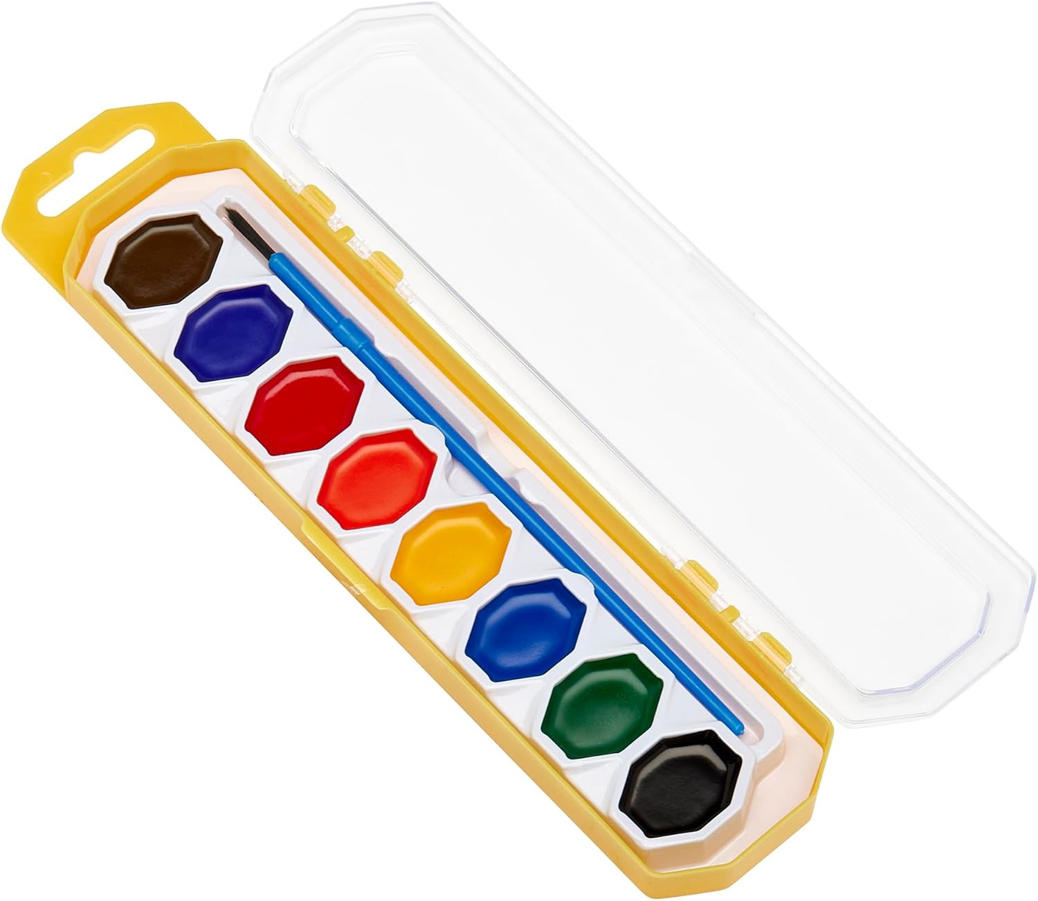 Stokes of genius to keep creativity flowing! These worry-free watercolors feature 8 brilliant colors and 1 artist brush to help kids paint like Van Gogh without leaving permanent marks or making a huge mess. Help kids appreciate the translucency of watercolors and explore application techniques. Teach them to wet the brush in between colors and dab on a paper towel to remove excess water and control color richness. Great for school or home arts and crafts. Dip in!