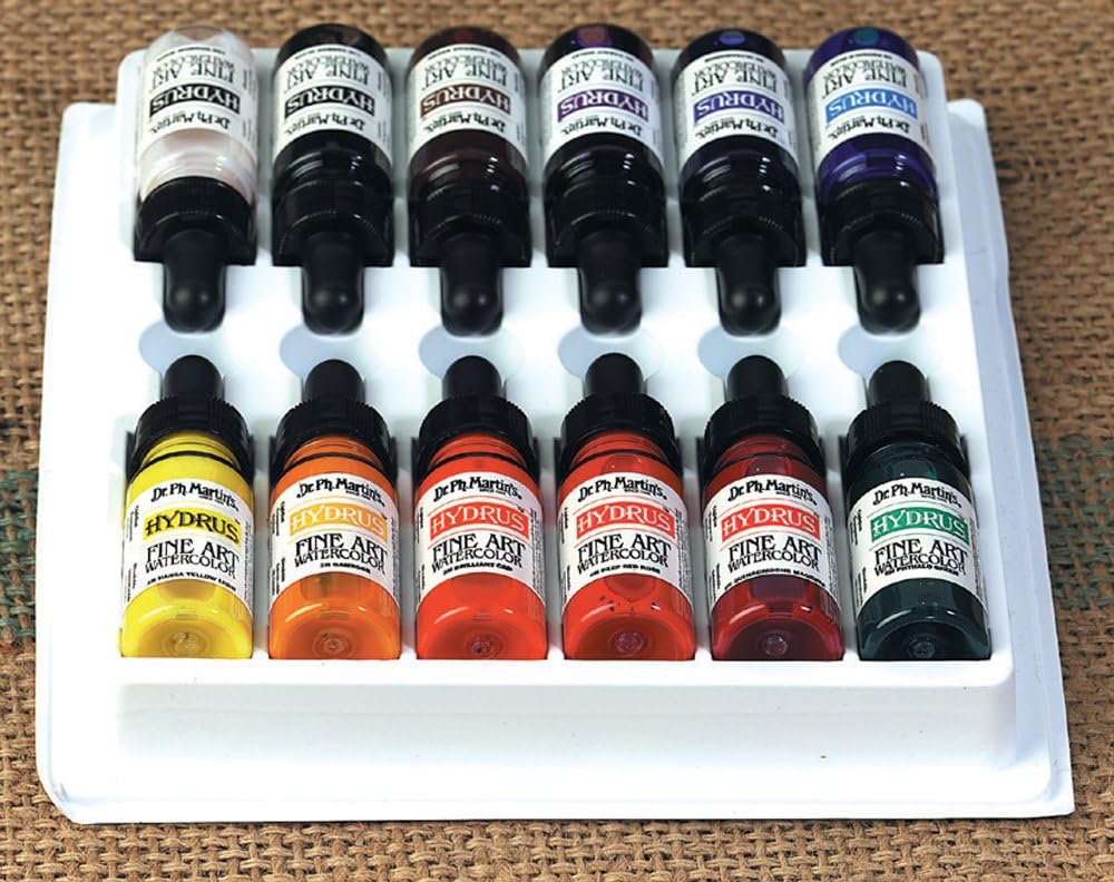 Dr. Ph. Martin’s Hydrus Fine Art Watercolor is lightfast, transparent, fine art quality watercolor in a plastic bottle. This liquid product delivers the same brilliance and permanency as traditional tube watercolors. Made from the finest artist pigments, Dr. Ph. Martin’s Hydrus Fine Art Watercolor can be blended and intermixed while still maintaining the transparency and luminosity of the colors. Each set comes in a tray that doubles as a mixing palette and bottle holder, with space for a water cup and twelve individual mixing wells. Great for use in technical, calligraphy, fountain pens, and in airbrushes. Each set includes 12 different colors in 0.5 oz (15 ml) plastic bottles with droppers and a custom mixing palette. Set 2 Colors: 13H Hansa Deep Yellow, 14H Yellow Ochre, 15H Permanent Red, 16H Cobalt Blue, 17H Indian Red, 18H Viridian Green, 19H Burnt Sienna, 20H Alizarin Crimson, 21H Sepia, 22H Payne’s Gray, 22H Payne’s Gray, 23H sap Green, 24H Burnt Umber.