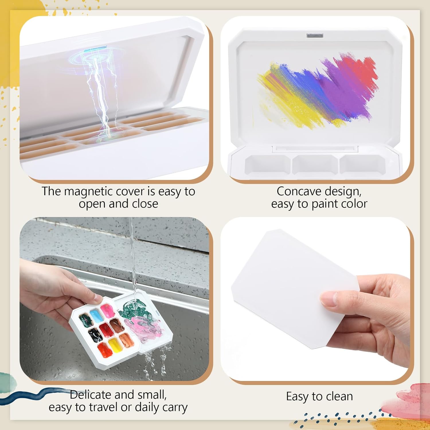 - Magnetic Openings: the watercolor travel palette contains magnetic openings that are easy to open and close; The smooth design will not affect your painting, and it is not easy to fall off, ensuring that the paints will not leak out