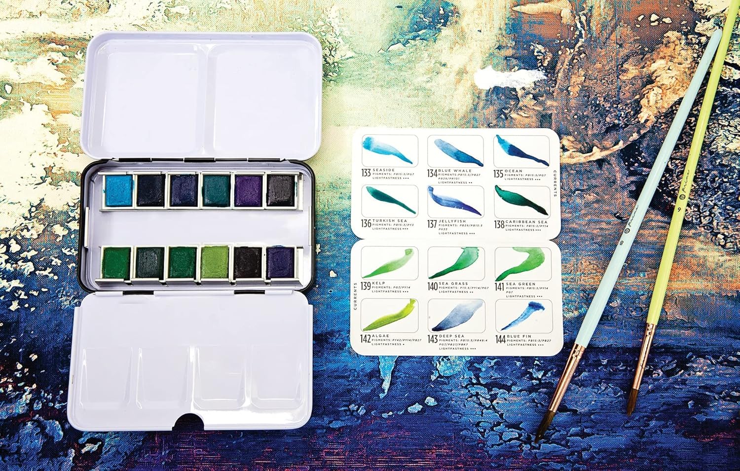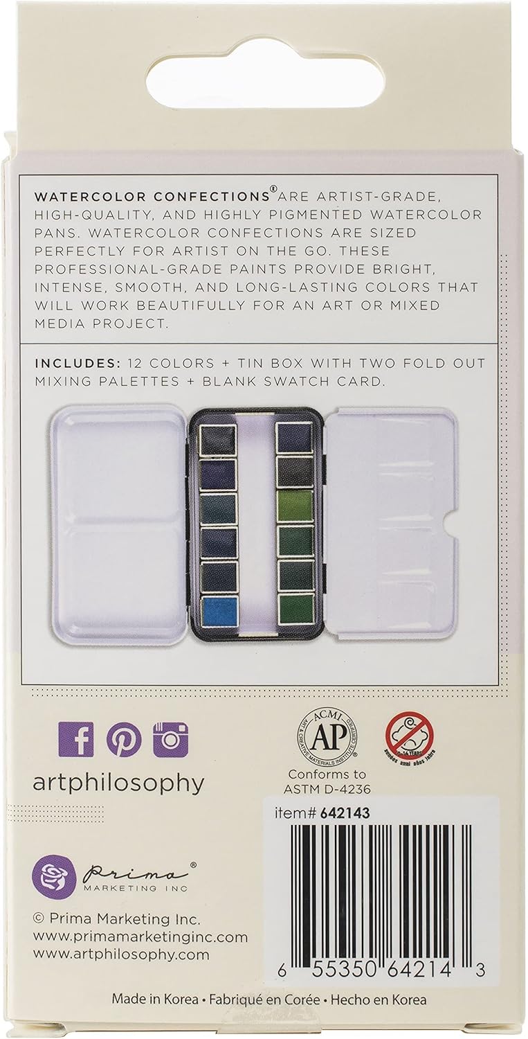 Create gorgeous scenes dressed in blue purple and green with the Currents Watercolor Confections watercolor painting set from Prima Marketing. This set includes 12 highly pigmented watercolors that quickly come to life with water. Grab up your favorite brush a cup of water and get creative at home or on the go. This set is 4.75 x 2.75 so you can easily take it anywhere you re hoping to let off a little creative steam. This metal tin also includes two fold out palettes for mixing your own variations of the rich included colors. Simply let your unique hues dry to bring back to life later or wipe up the mixing areas when you re finished to create more original tones. The Currents set has colors that are perfect for painting water scenes forests creeks mermaids magical places and more