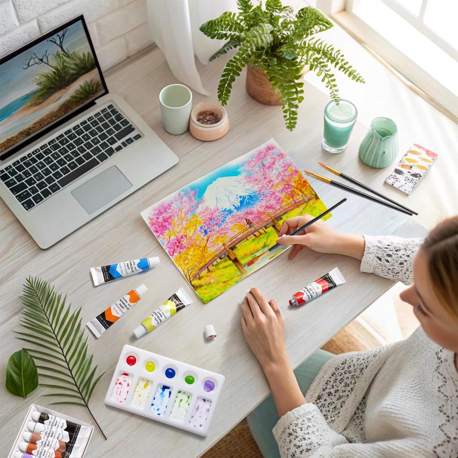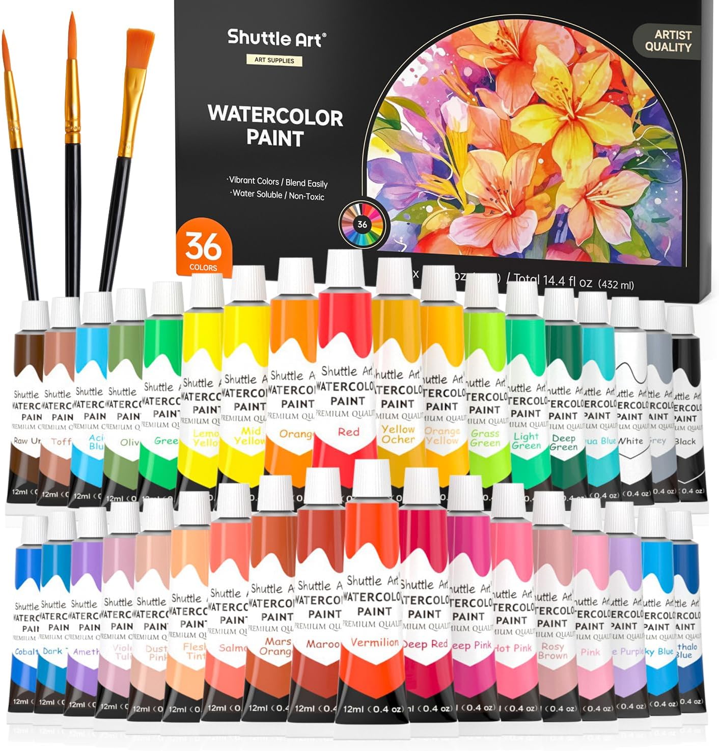 Chalkola Watercolor Paint Set for Adults, Kids, Beginner & Professional Artists - 36 Watercolor Tubes Set (12ml, 0.4oz), 10 Painting Brushes & 1 Palette | Vibrant Water Color Art Painting Supplies